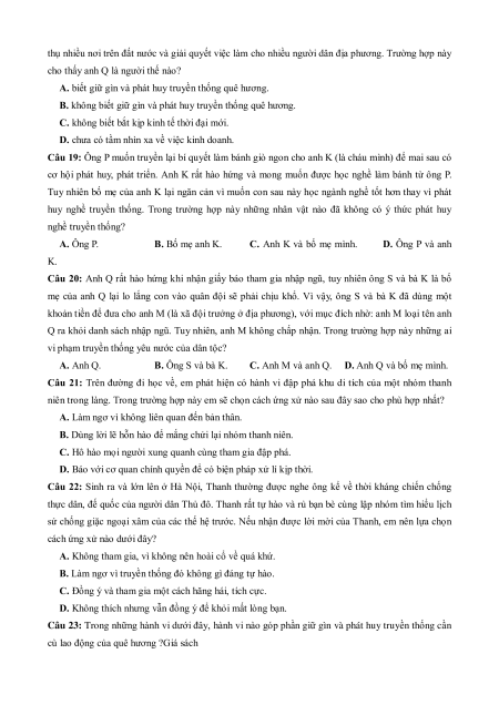 Câu 23: Trong những hành vi dưới đây, hành vi nào góp phần giữ gìn và phát huy truyền thống cần
