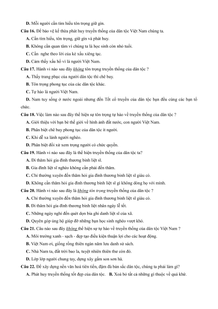 Câu 18. Việc làm nào sau đây thể hiện sự tôn trọng tự hào về truyền thống của dân tộc ?