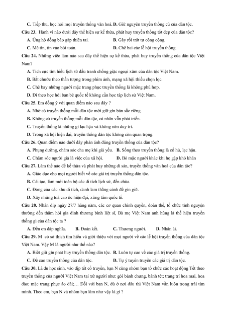 Câu 23. Hành vi nào dưới đây thể hiện sự kế thừa, phát huy truyền thống tốt đẹp của dân tộc?
