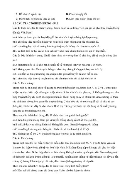 Câu 26. Quan điểm nào dưới đây phản ánh đúng truyền thống của dân tộc?