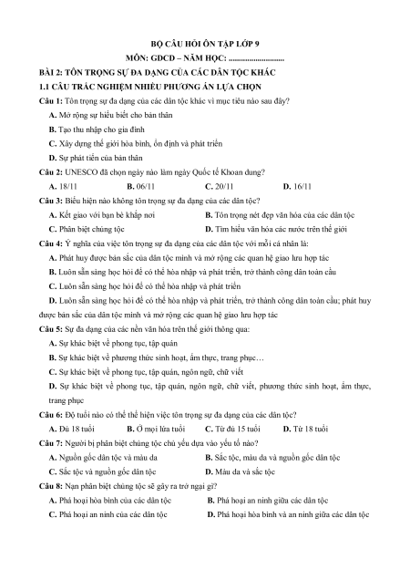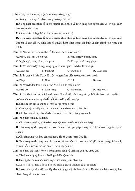 Câu 6: Độ tuổi nào có thể thể hiện việc tôn trọng sự đa dạng của các dân tộc? A. Đủ 18 tuổi