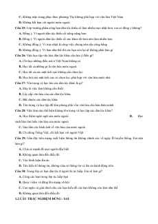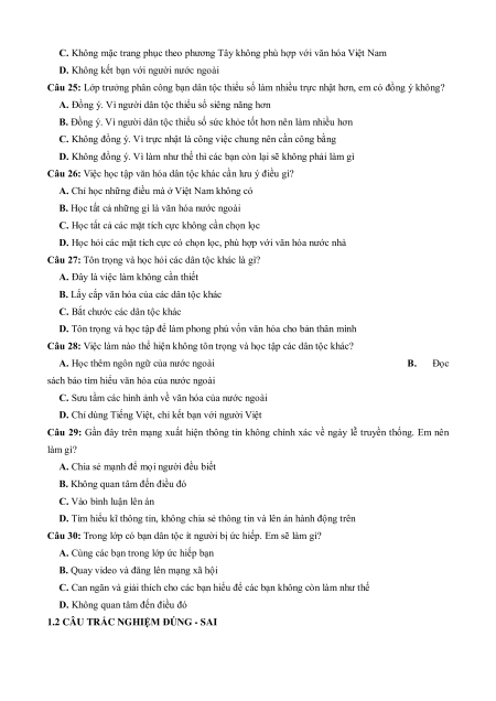 Câu 21: Việc tìm hiểu các món bánh của đồng bào Khơ-me thể hiện sự tôn trọng về mặt nào? A. Về trang phục B. Về tập quán C. Về ẩm thực D. Về ngôn ngữ