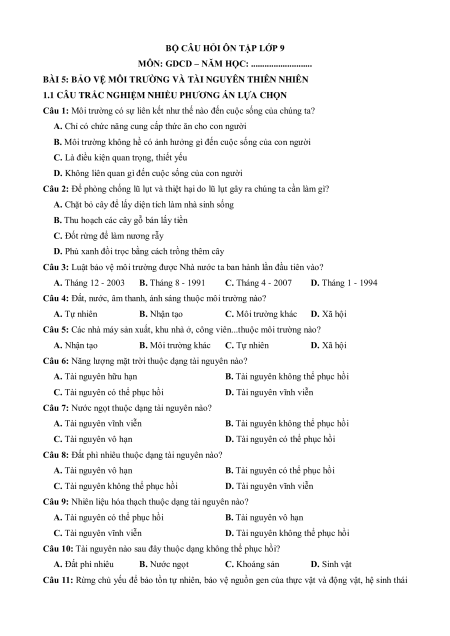- Tailieugiaovien.com.vn giới thiệu Câu hỏi ôn tập + Đề kiểm tra GDCD 8 theo Bài học (chung cho ba sách) Bài 5: Bảo vệ môi trường và tài nguyên thiên nhiên