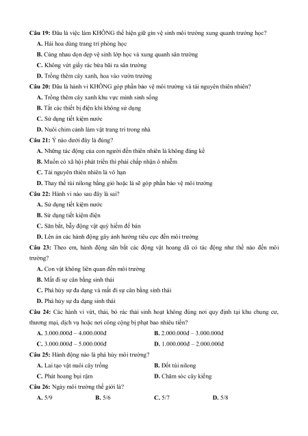Câu 26: Ngày môi trường thế giới là? A. 5/9 B. 5/6 C. 5/7 D. 5/8