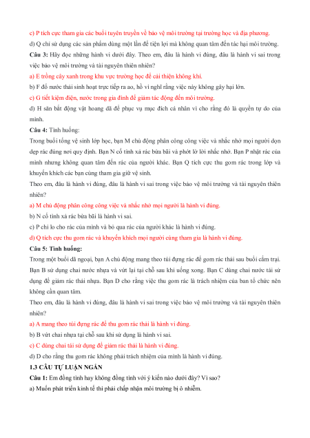 Câu 1: Theo em, đâu là hành vi đúng, đâu là hành vi sai trong việc bảo vệ môi trường và tài nguyên thiên nhiên?