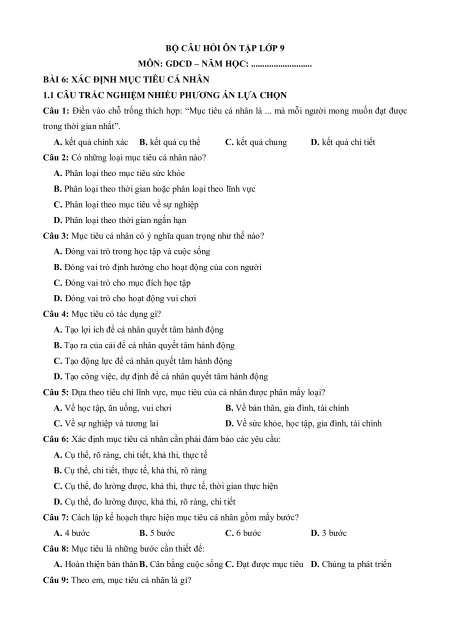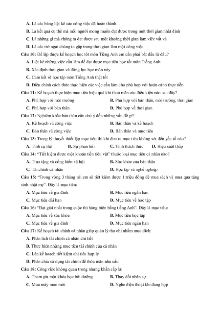 Câu 7: Cách lập kế hoạch thực hiện mục tiêu cá nhân gồm mấy bước? A. 4 bước B. 5 bước C. 6 bước D. 3 bước