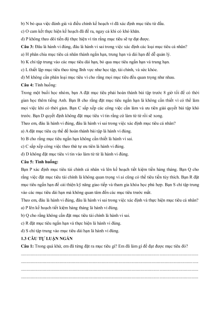 Câu 1: Đâu là hành vi đúng, đâu là hành vi sai trong việc xác định mục tiêu cá nhân?