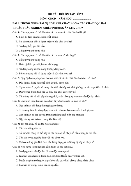 BÀI 9. PHÒNG NGỪA TAI NẠN VŨ KHÍ, CHÁY NỔ VÀ CÁC CHẤT ĐỘC HẠI