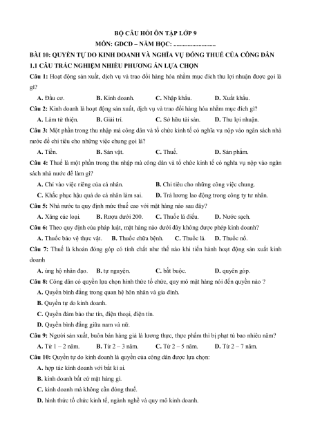 - Tailieugiaovien.com.vn giới thiệu Câu hỏi ôn tập + Đề kiểm tra GDCD 9 theo Bài học (chung cho ba sách) Bài 10: Quyền tự do kinh doanh và nghĩa vụ đóng thuế của công dân