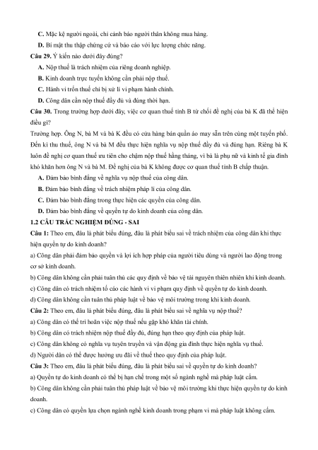 Câu 22. Nội dung nào sau đây không phản ánh đúng nghĩa vụ của công dân về tự do kinh doanh?