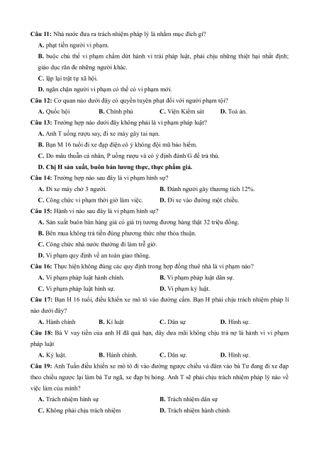 Câu 17: Bạn H 16 tuổi, điều khiển xe mô tô vào đường cấm. Bạn H phải chịu trách nhiệm pháp lí nào dưới đây? A. Hành chính B. Kỉ luật C. Dân sự D. Hình sự.