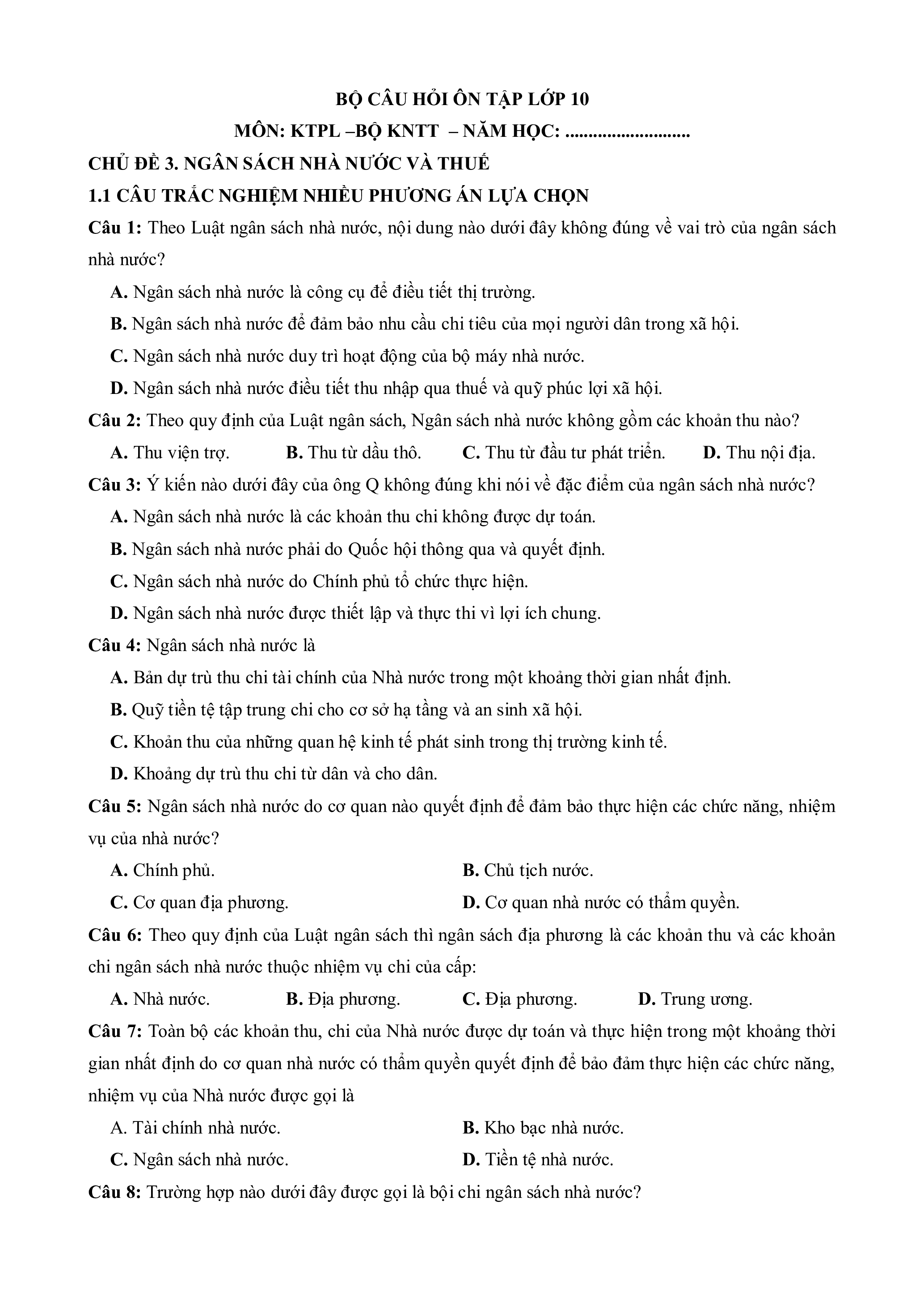Câu hỏi ôn tập + Đề kiểm tra KTPL 10 Chủ đề 3 (chung cho ba sách)