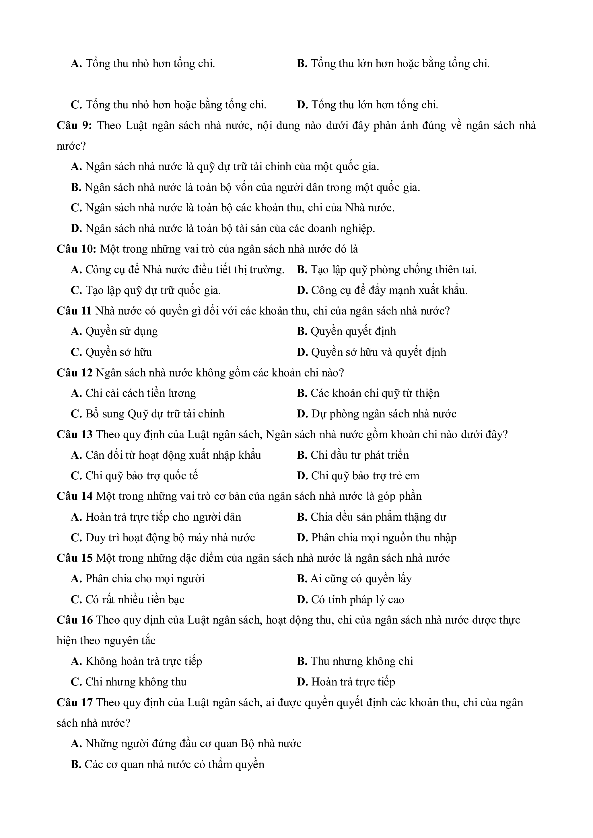 Câu 7: Toàn bộ các khoản thu, chi của Nhà nước được dự toán và thực hiện trong một khoảng thời