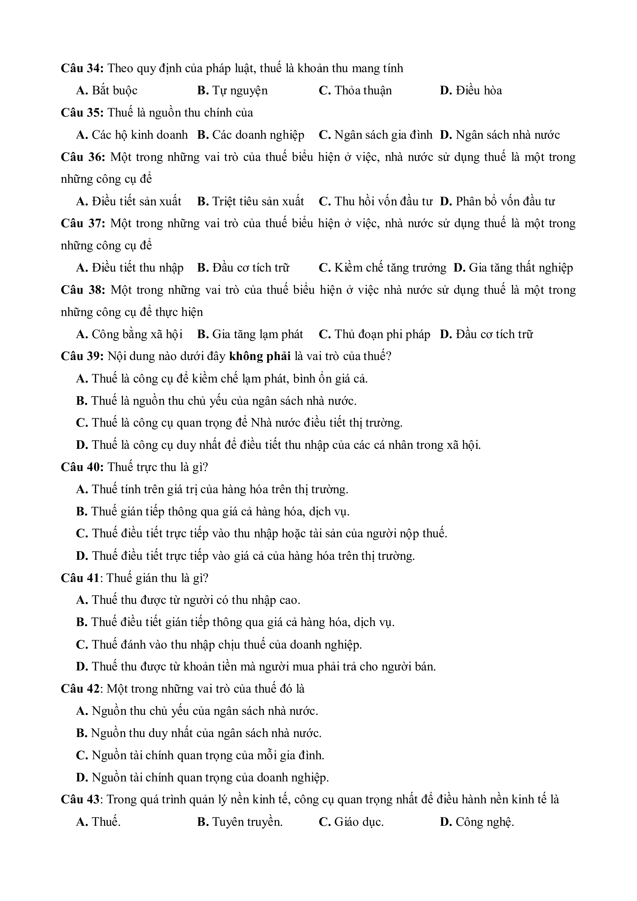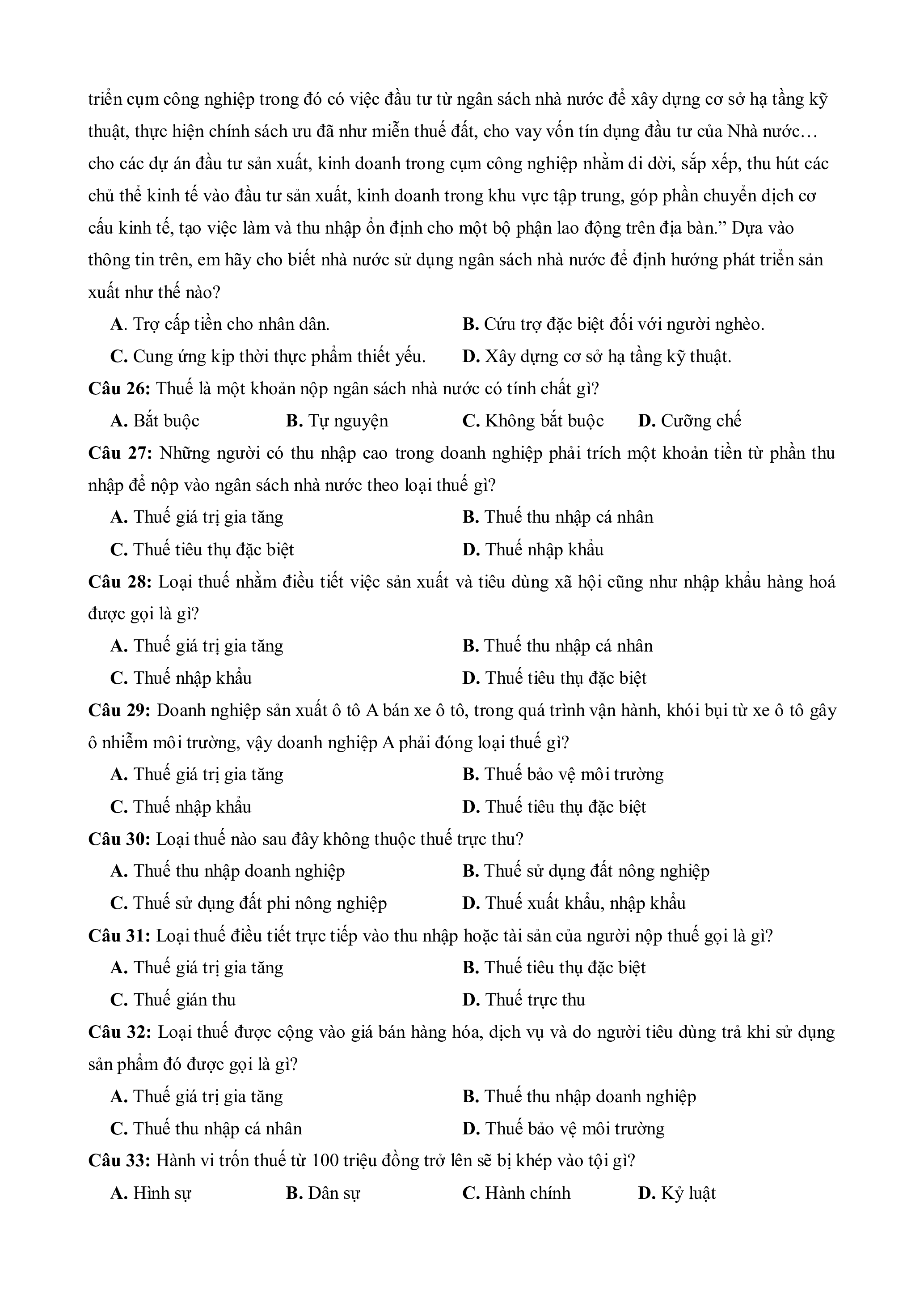 Câu 26: Thuế là một khoản nộp ngân sách nhà nước có tính chất gì? A. Bắt buộc B. Tự nguyện C. Không bắt buộc D. Cưỡng chế