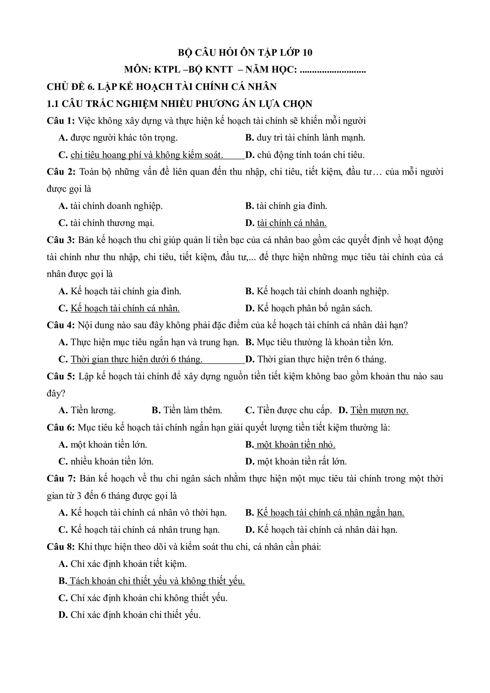 Câu hỏi ôn tập + Đề kiểm tra KTPL 10 Chủ đề 6 (chung cho ba sách)