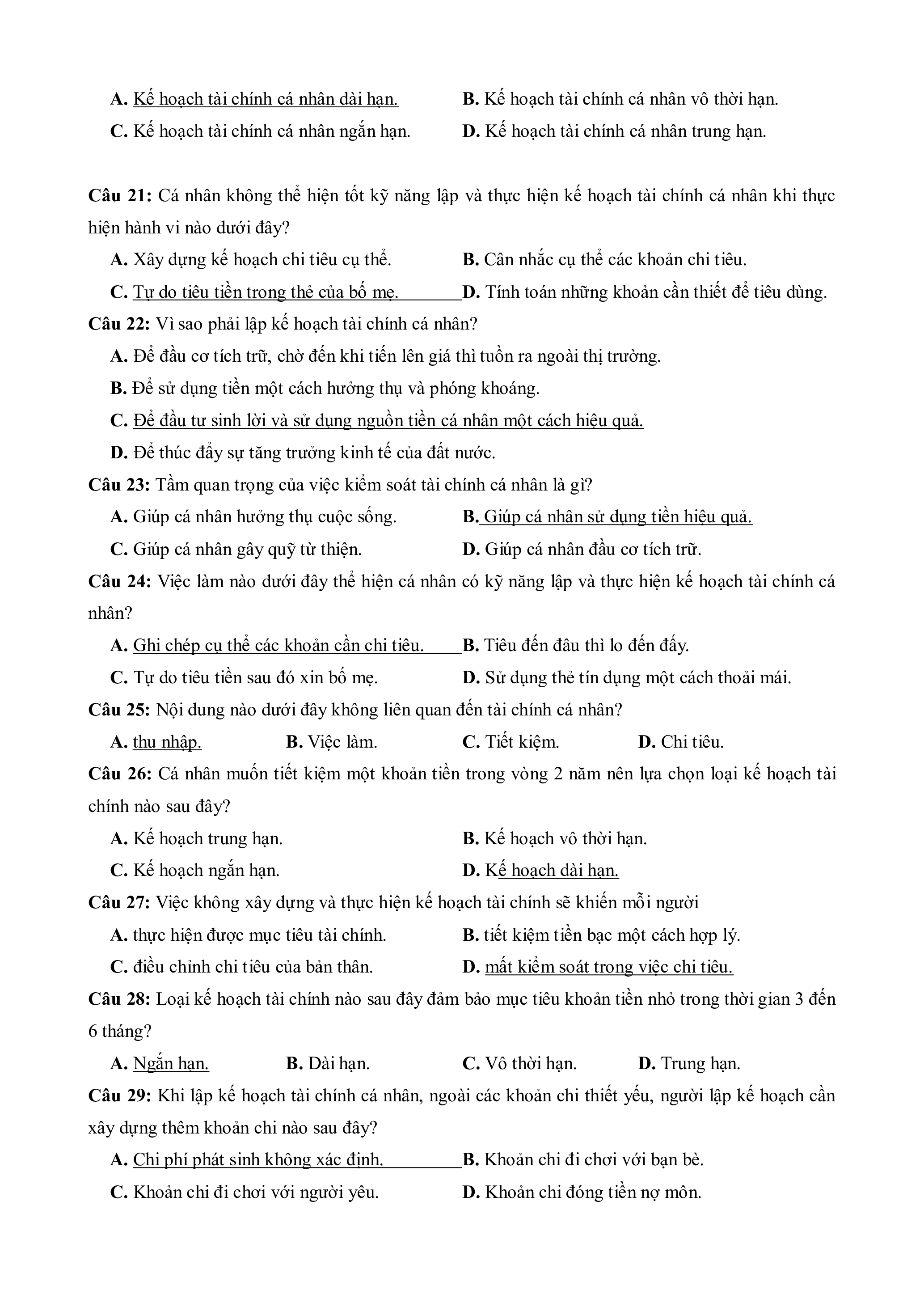 Câu 25: Nội dung nào dưới đây không liên quan đến tài chính cá nhân? A. thu nhập. B. Việc làm. C. Tiết kiệm. D. Chi tiêu.