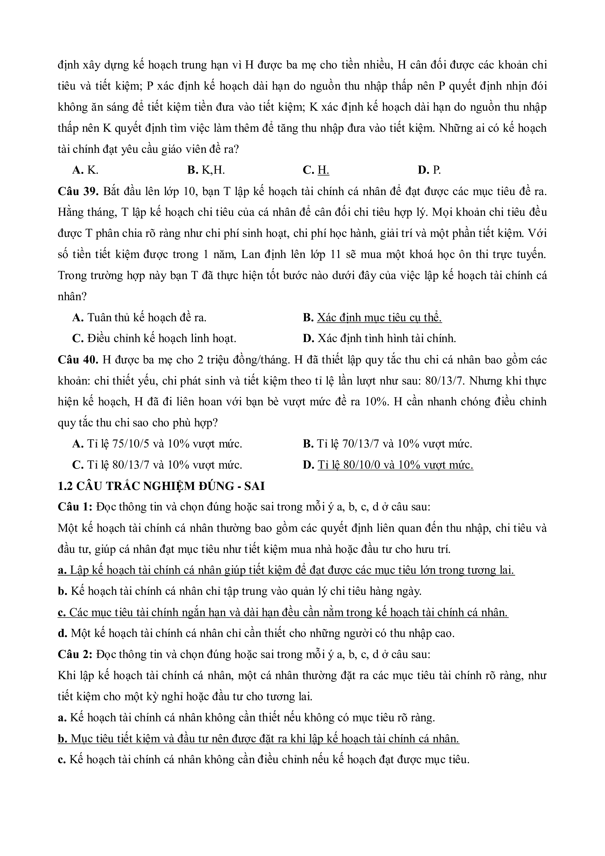 Câu 38. Trong một bài tập về nhà, giáo viên yêu cầu học sinh xây dựng kế hoạch tài chính cá nhân