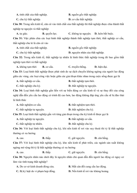 Câu 30: Trong nền kinh tế, căn cứ vào tính chất của thất nghiệp thì thất nghiệp được chia thành thất