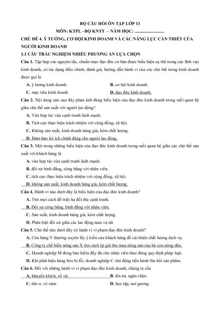 Câu 2. Nội dung nào sau đây phản ánh đúng biểu hiện của đạo đức kinh doanh trong mối quan hệ