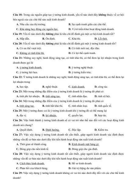 Câu 22: Ý tưởng kinh doanh là những suy nghĩ, hành động sáng tạo, có tính khả thi, có thể đem lại lợi nhuận trong A. học tập. B. nghệ thuật. C. kinh doanh. D. công tác.