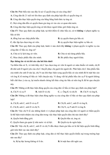 Câu 22: Việc chị B, anh C, anh D và chị N đều được tham gia bầu cử là thể hiện quyền bình đẳng