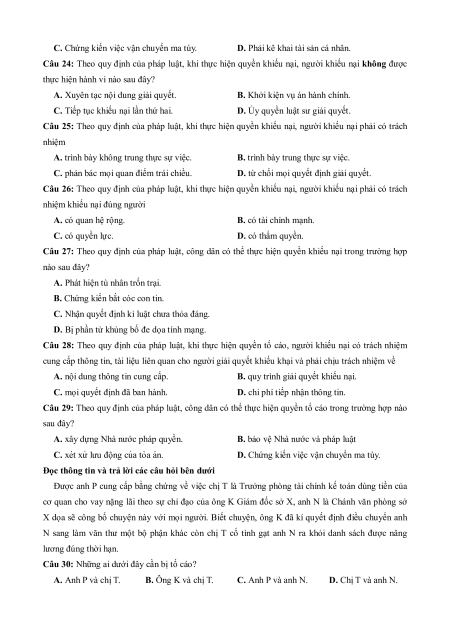 Câu 24: Theo quy định của pháp luật, khi thực hiện quyền khiếu nại, người khiếu nại không được