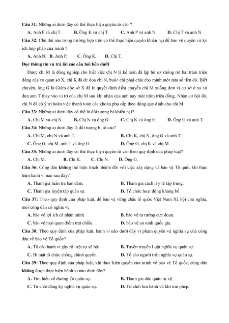Câu 30: Những ai dưới đây cần bị tố cáo? A. Anh P và chị T. B. Ông K và chị T. C. Anh P và anh N. D. Chị T và anh N.