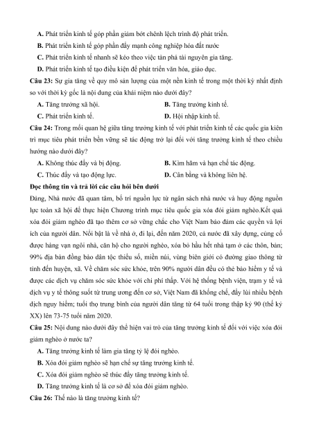 Câu 25: Nội dung nào dưới đây thể hiện vai trò của tăng trưởng kinh tế đối với việc xóa đói giảm nghèo ở nước ta?