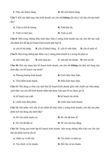 Câu 13: Trong quá trình lập kế hoạch kinh doanh, một trong những điều kiện mà cần chủ