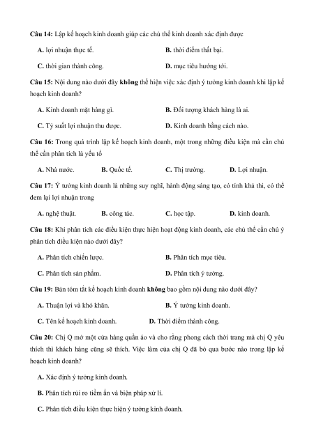 Câu 14: Lập kế hoạch kinh doanh giúp các chủ thể kinh doanh xác định được