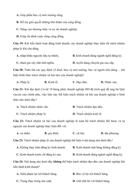 Câu 19: Khi tiến hành hoạt động kinh doanh, các doanh nghiệp thực hiện tốt trách nhiệm pháp lý khi chủ động