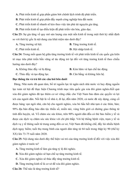 Câu 21: Nội dung nào dưới đây không thể hiện vai trò của tăng trưởng và phát triển kinh tế đối với mỗi quốc gia?