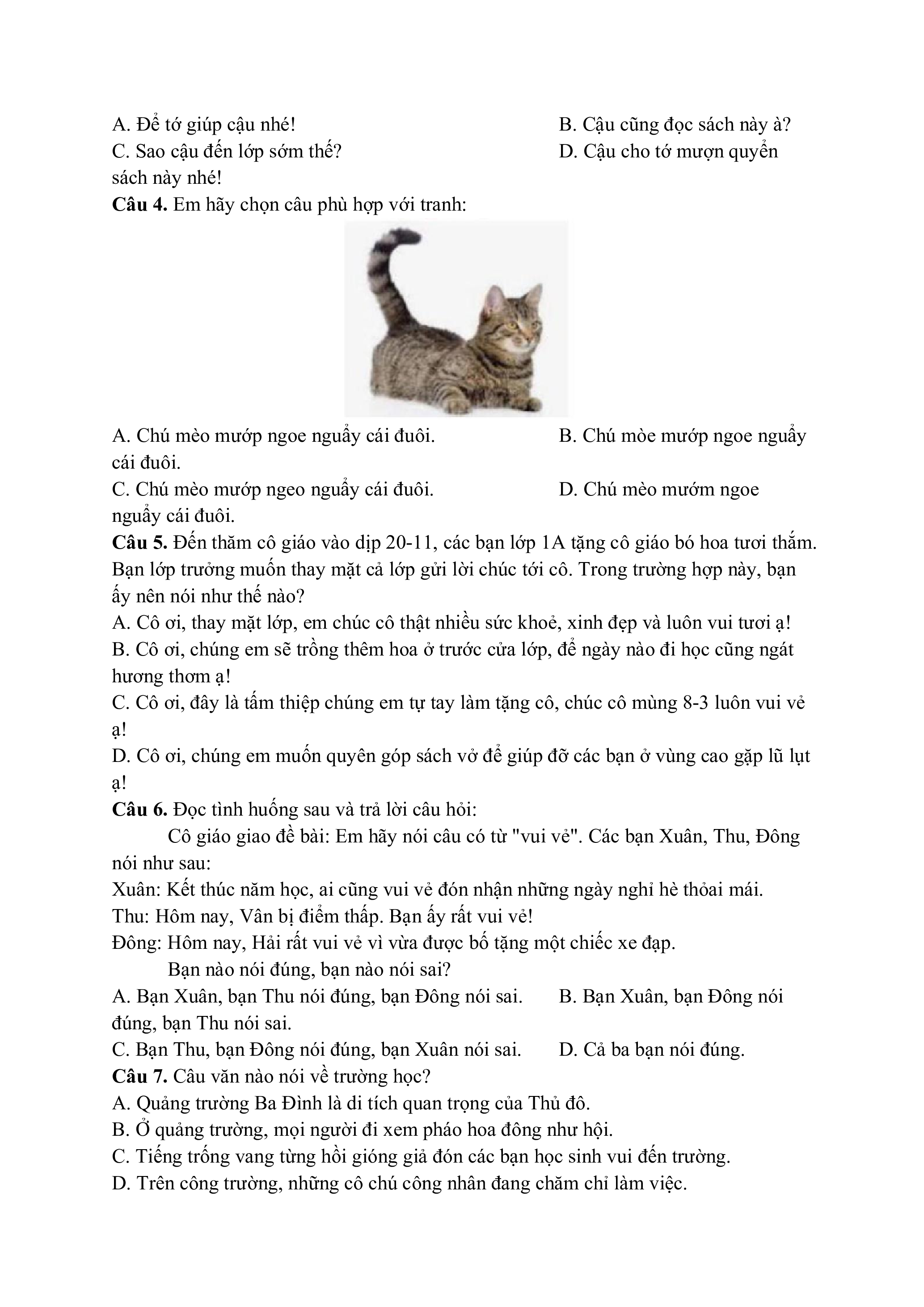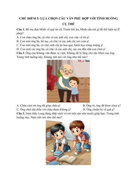 Câu hỏi ôn thi Trạng Nguyên Tiếng Việt lớp 1 Chủ điểm 5: Lựa chọn câu văn phù hợp với tình huống cụ thể