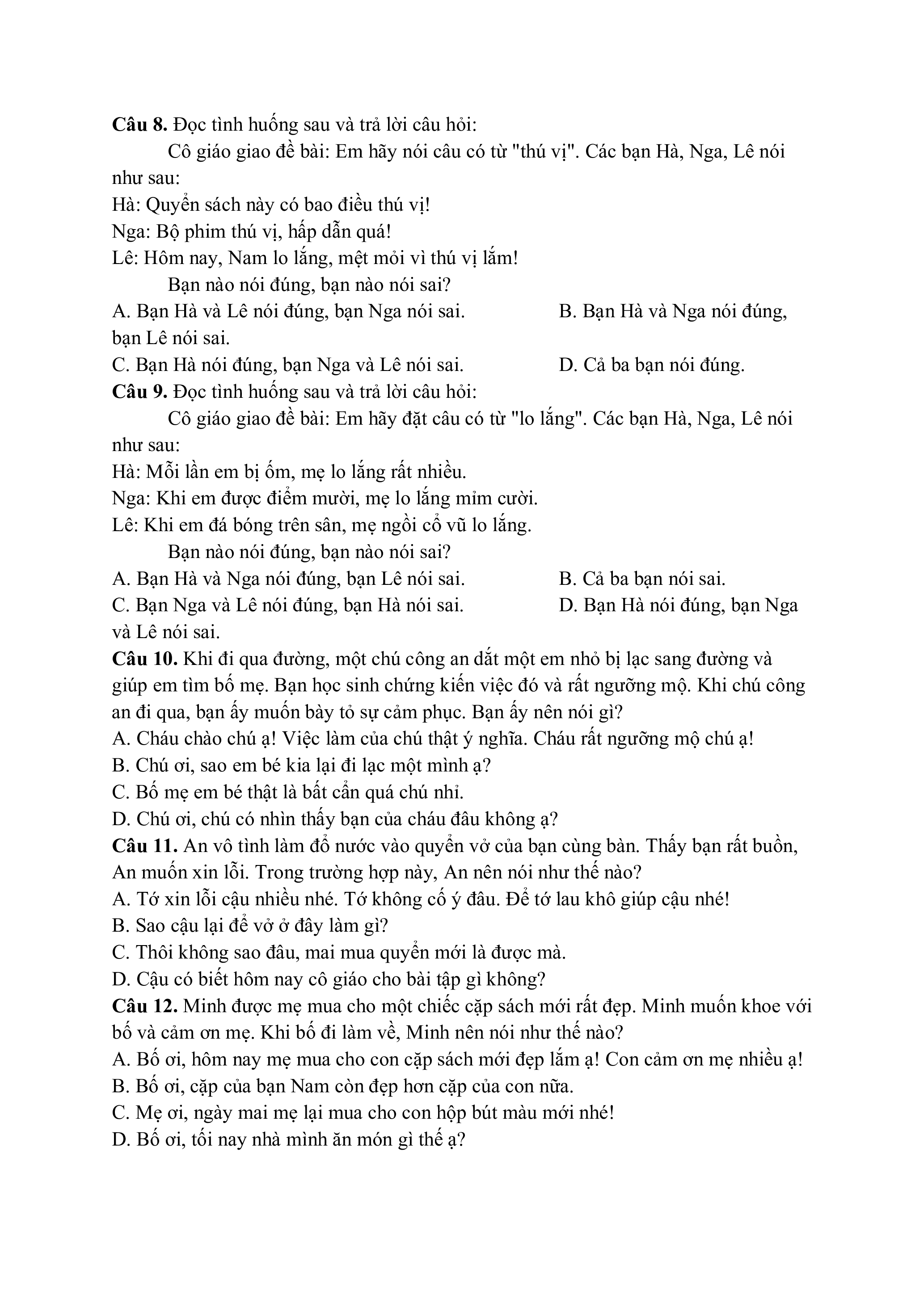 Câu 11. An vô tình làm đổ nước vào quyển vở của bạn cùng bàn. Thấy bạn rất buồn,