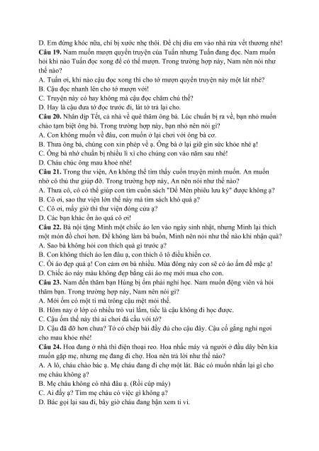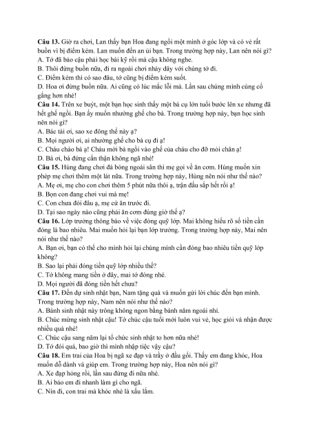 Câu 18. Em trai của Hoa bị ngã xe đạp và trầy ở đầu gối. Thấy em đang khóc, Hoa