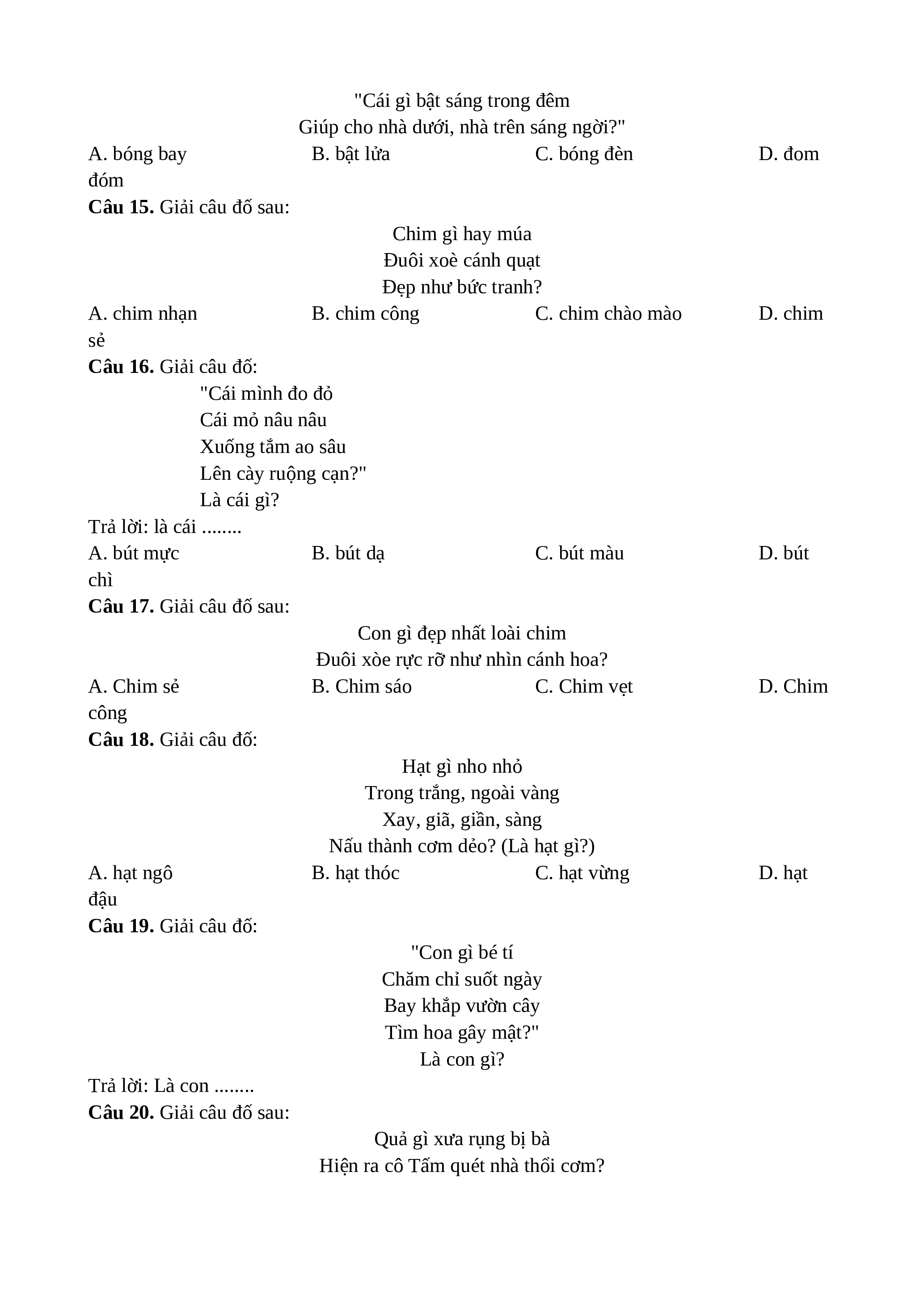 Câu 15. Giải câu đố sau: Chim gì hay múa Đuôi xoè cánh quạt Đẹp như bức tranh? A. chim nhạn B. chim công C. chim chào mào D. chim sẻ