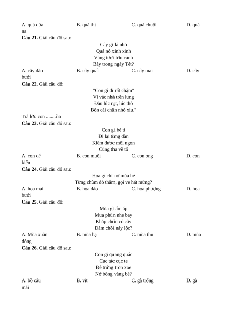 Câu 21. Giải câu đố sau: Cây gì lá nhỏ Quả nó xinh xinh Vàng tươi trĩu cành Bày trong ngày Tết? A. cây đào B. cây quất C. cây mai D. cây bưởi