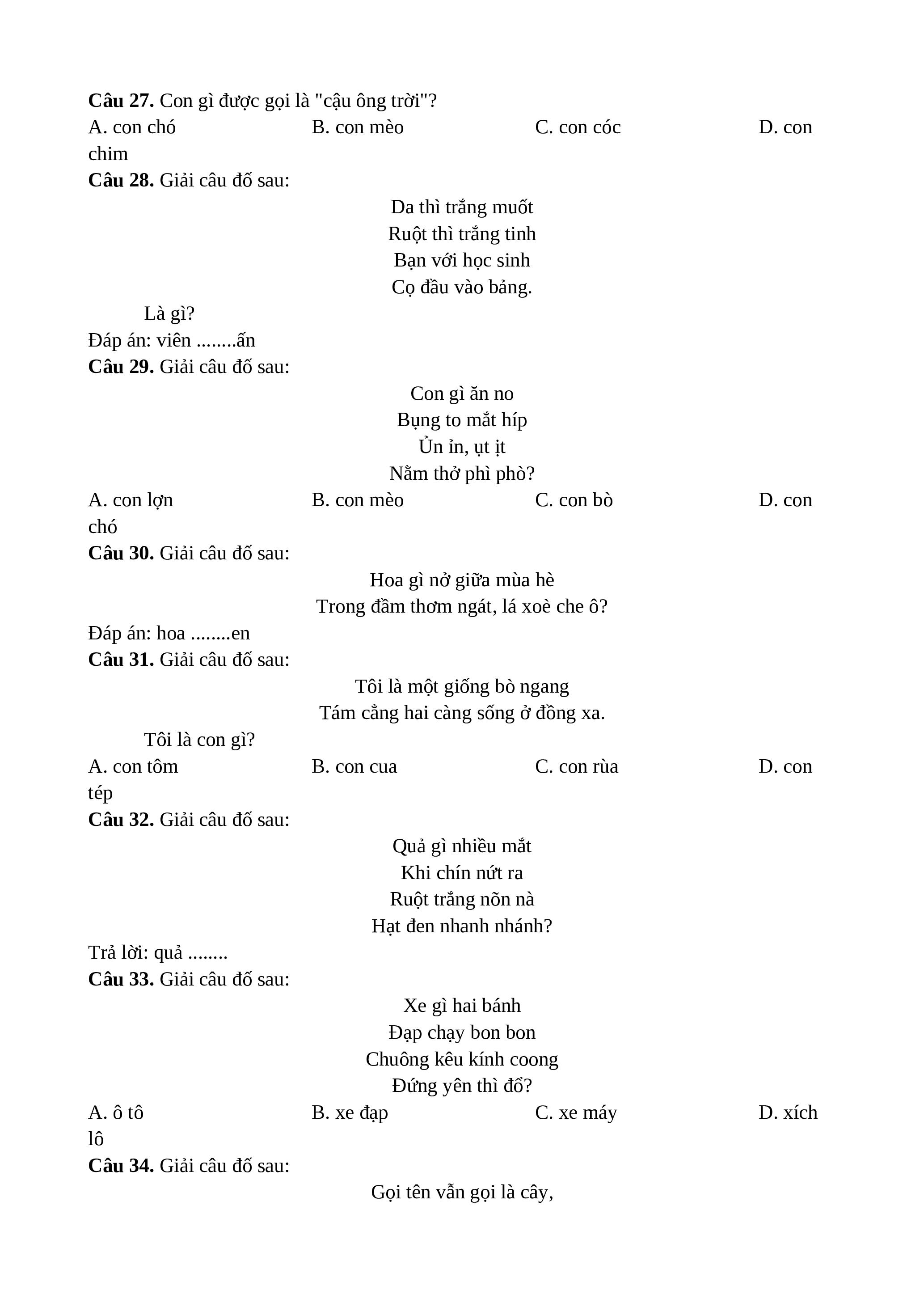 Câu 26. Giải câu đố sau: Con gì quang quác Cục tác cục te Đẻ trứng tròn xoe Nở bông vàng bé? A. bồ câu B. vịt C. gà trống D. gà mái