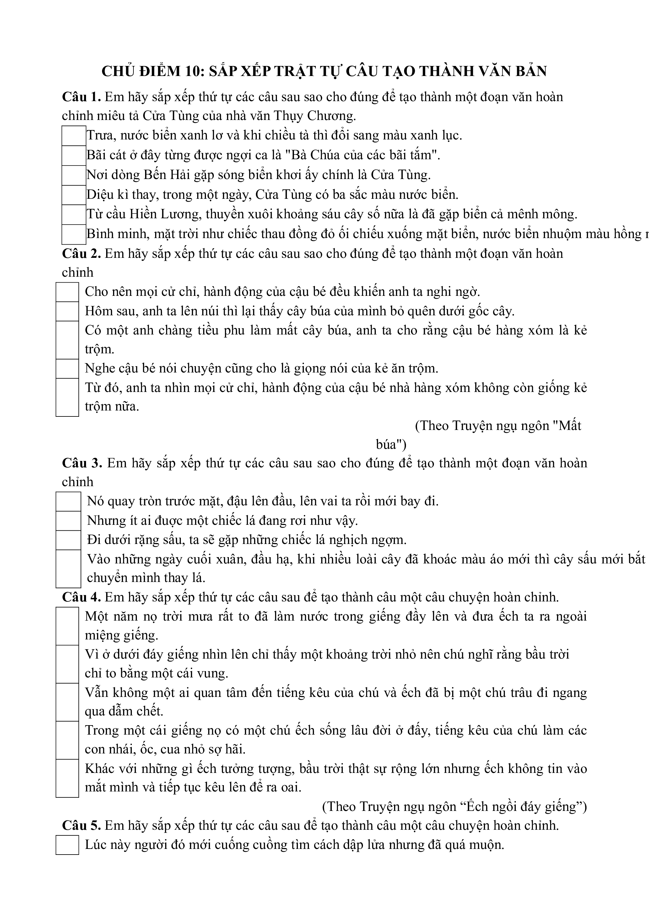 CHỦ ĐIỂM 10: SẮP XẾP TRẬT TỰ CÂU TẠO THÀNH VĂN BẢN