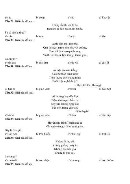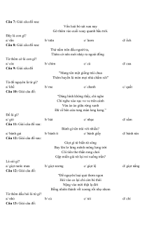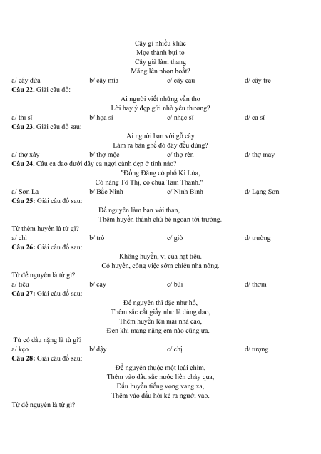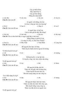 Câu 21: Giải câu đố sau: Cây gì nhiều khúc Mọc thành bụi to Cây già làm thang Măng lên nhọn hoắt? a/ cây dừa b/ cây mía c/ cây cau d/ cây tre