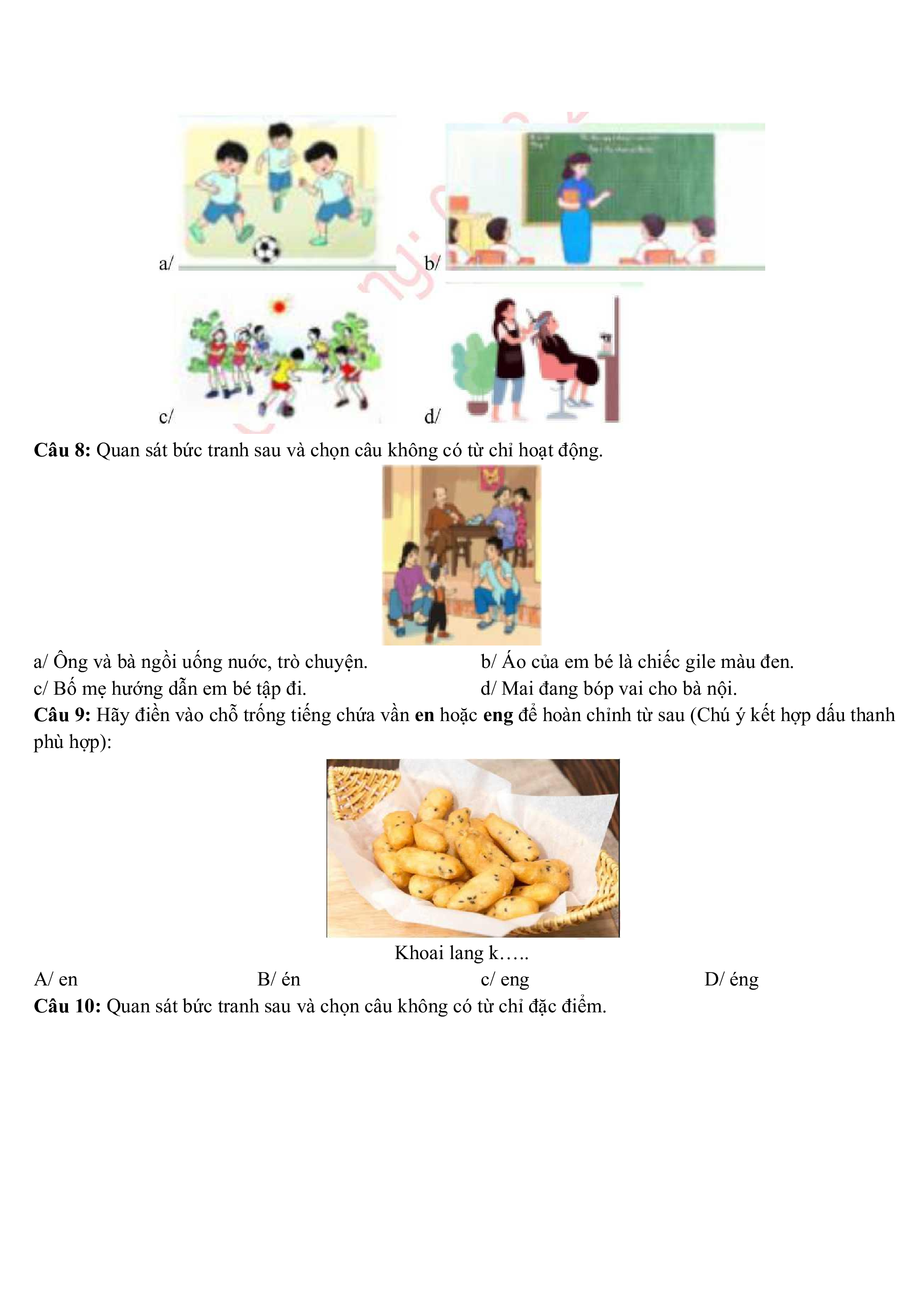 Câu 9: Hãy điền vào chỗ trống tiếng chứa vần en hoặc eng để hoàn chỉnh từ sau (Chú ý kết hợp dấu thanh phù hợp): Khoai lang k…. A/ en B/ én c/ eng D/ éng