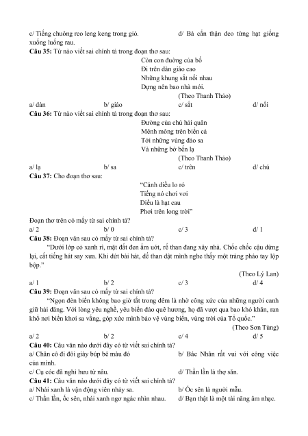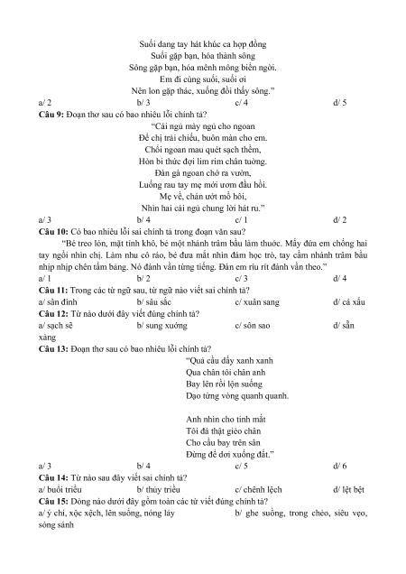 Câu 13: Đoạn thơ sau có bao nhiêu lỗi chính tả? “Quả cầu dấy xanh xanh Qua chân tôi chân anh Bay lên rồi lộn suống
