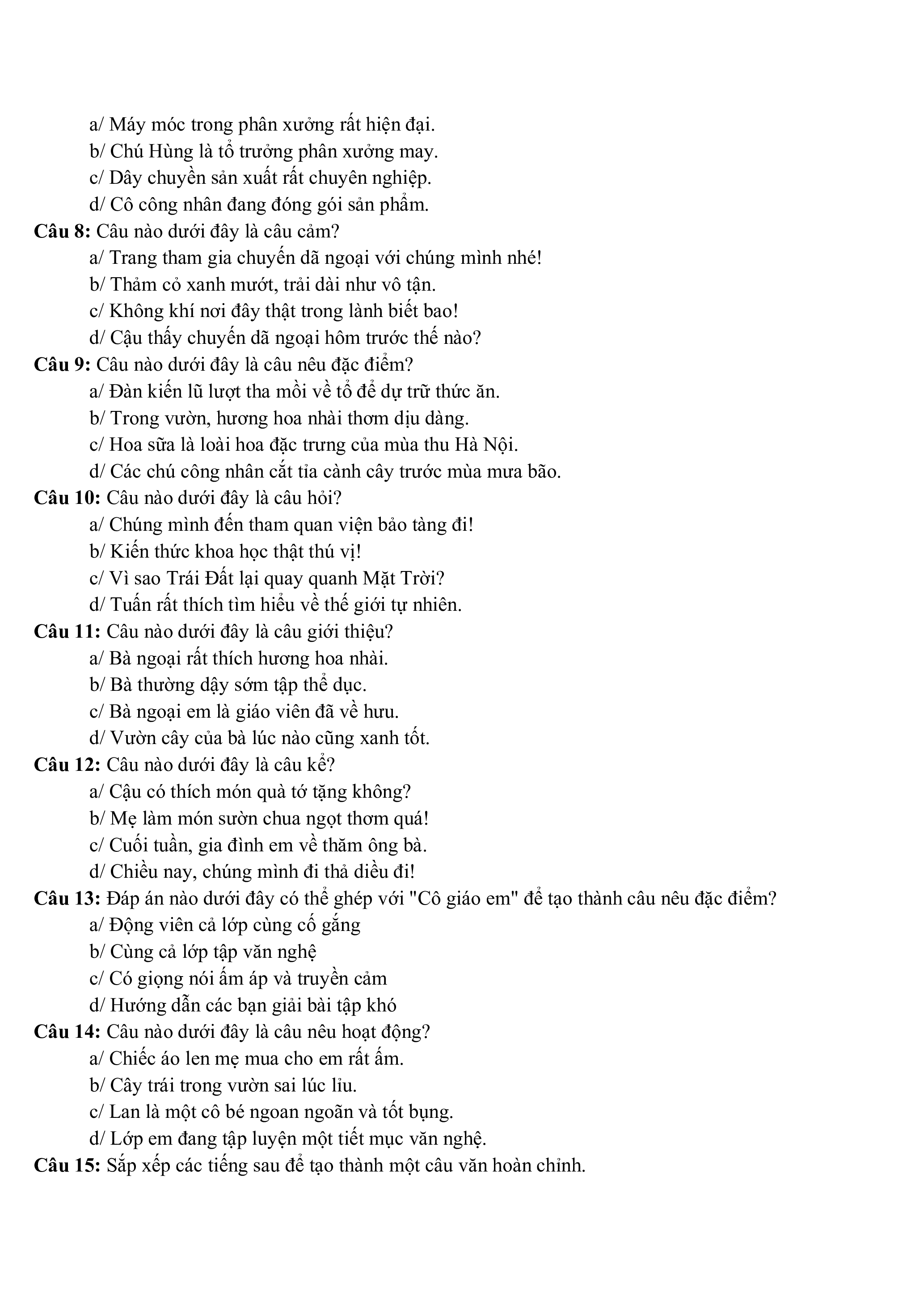 Câu 15: Sắp xếp các tiếng sau để tạo thành một câu văn hoàn chỉnh.