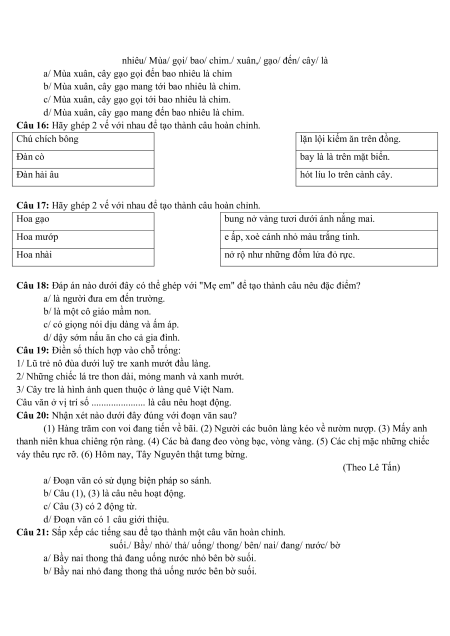 Câu 21: Sắp xếp các tiếng sau để tạo thành một câu văn hoàn chỉnh.