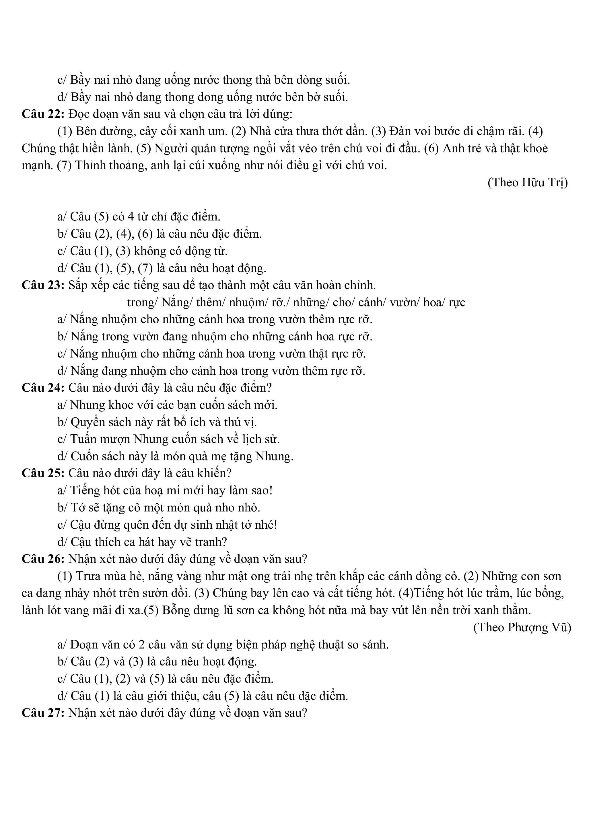 Câu 23: Sắp xếp các tiếng sau để tạo thành một câu văn hoàn chỉnh.