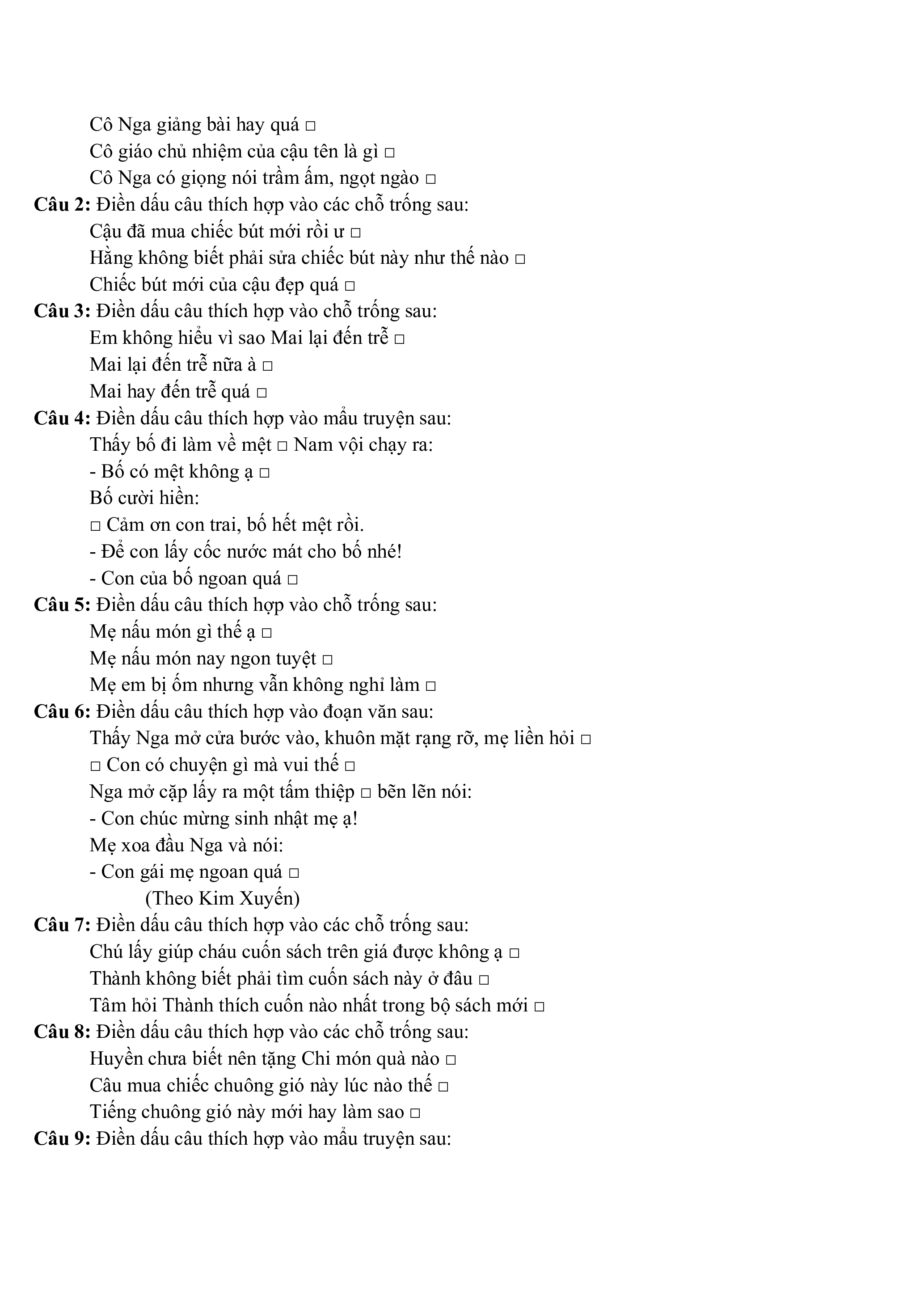 Câu 1: Điền dấu câu thích hợp vào các ô trống sau: