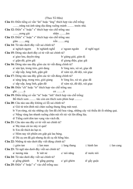 Câu 13: Điền” x” hoặc” s” thích hợp vào chỗ trống sau: giàu . . . . .ang xốn . . . . .ang
