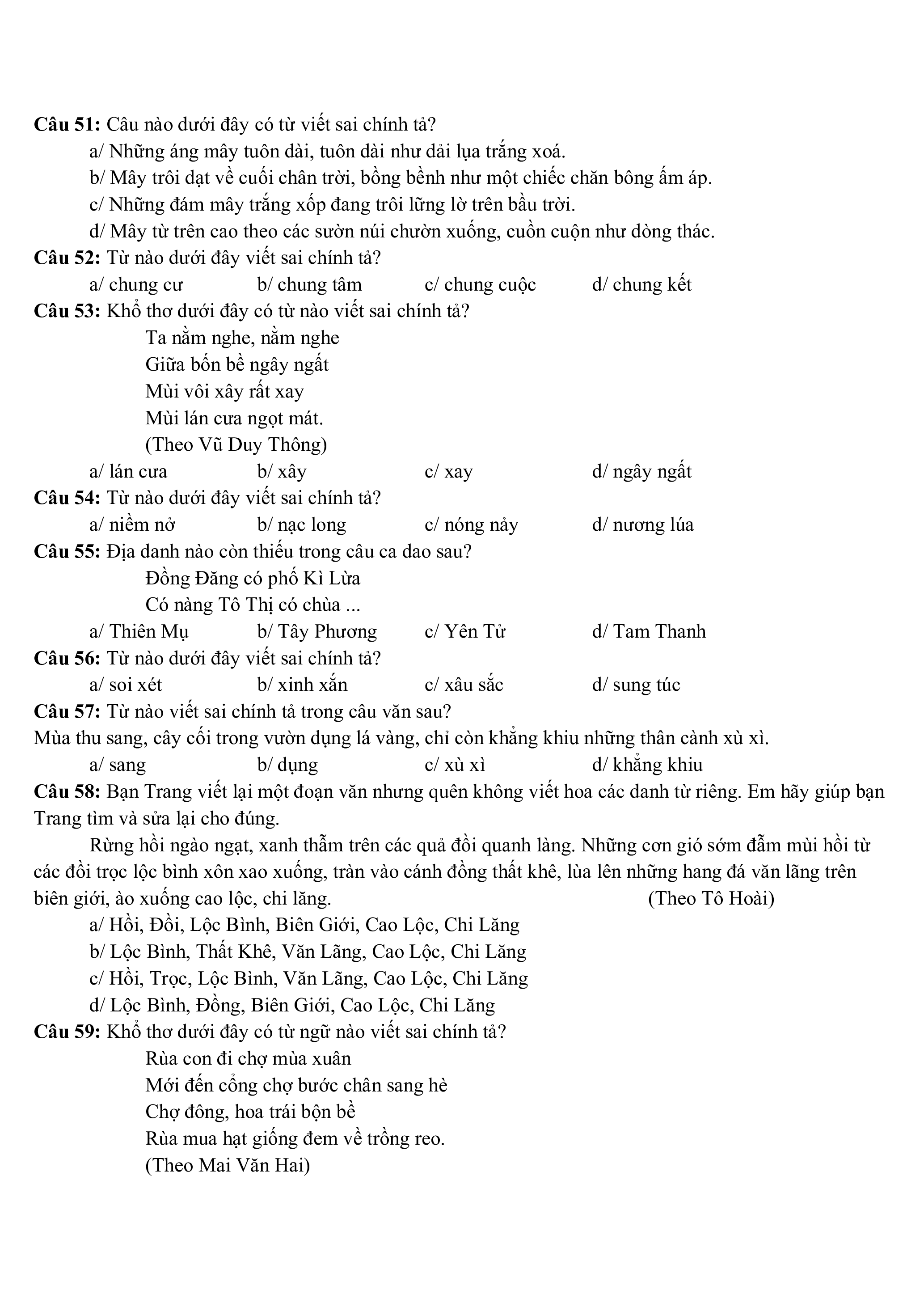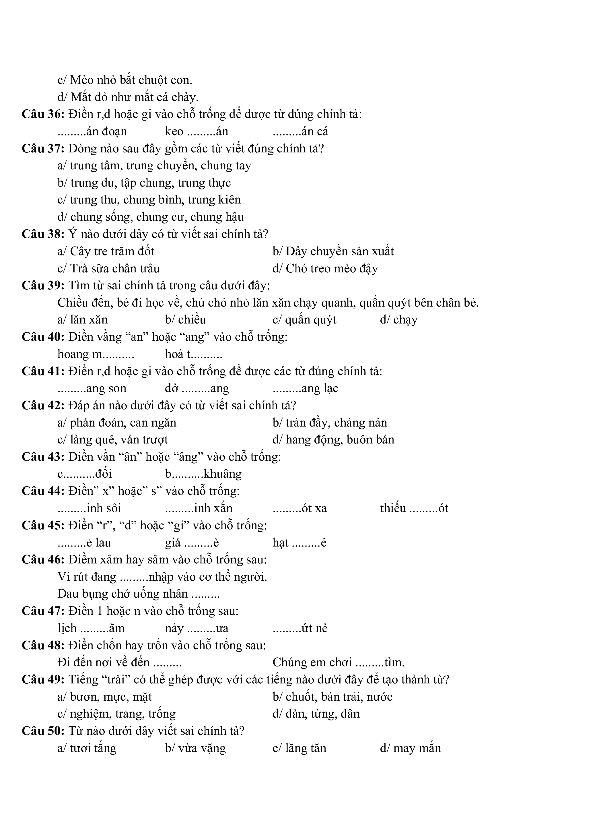 Câu 50: Từ nào dưới đây viết sai chính tả? a/ tươi tắng b/ vừa vặng c/ lăng tăn d/ may mắn