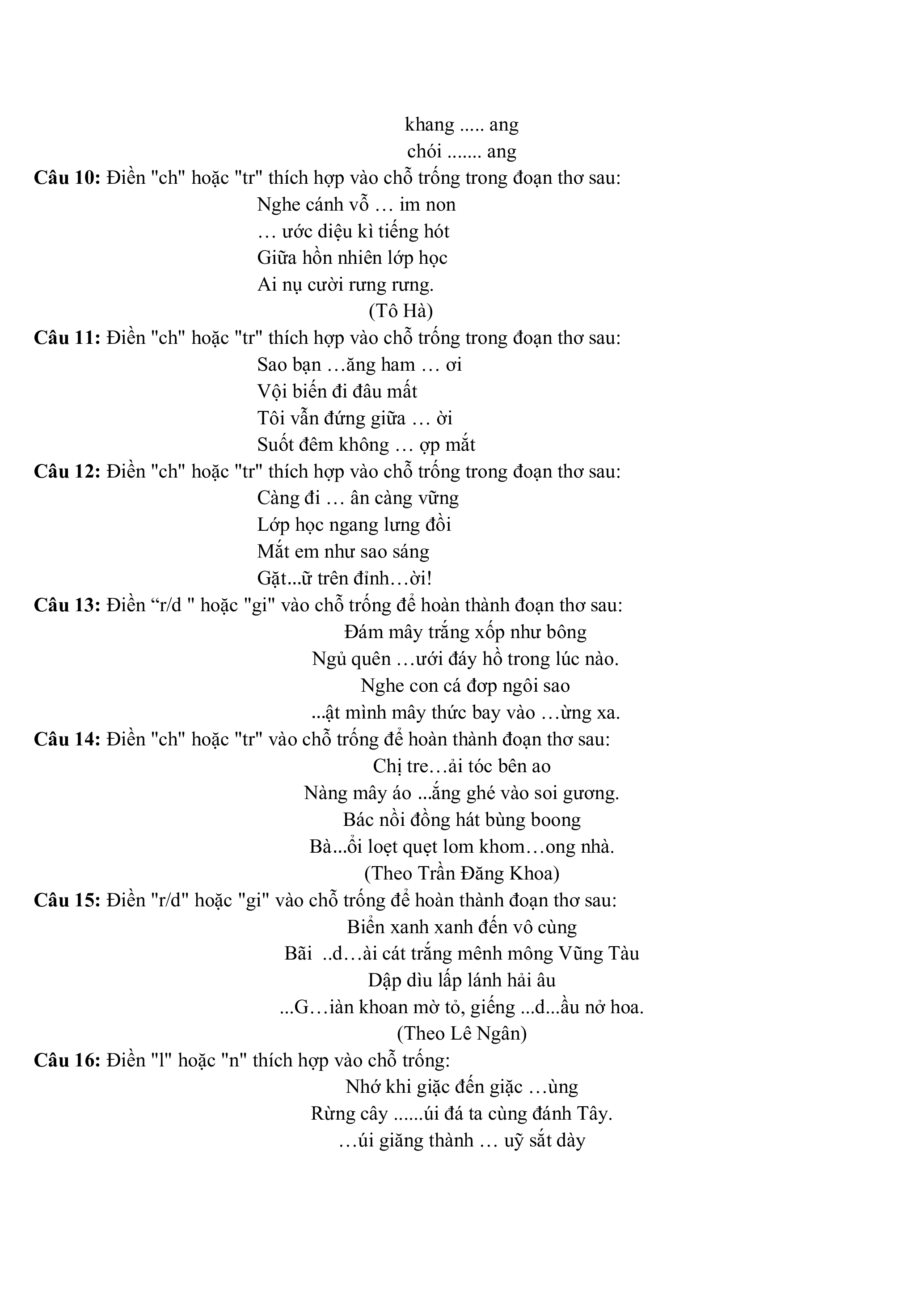 Câu 12: Điền "ch" hoặc "tr" thích hợp vào chỗ trống trong đoạn thơ sau: Càng đi … ân càng vững Lớp học ngang lưng đồi Mắt em như sao sáng