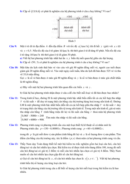 b) Cặp số 13;9,6 có phải là nghiệm của hệ phương trình ở câu a hay không? Vì sao? Hinh 3 Câu 9: